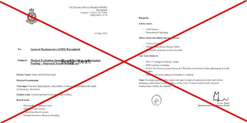 Posts from multiple Indian users on social media platform X on May 2, 2025, shared an alleged medical evaluation summary from the Pak Emirates Military Hospital in Rawalpindi about PTI founder Imran Khan’s suspected sexual assault in Adiala Jail. However, the document is fake and no such incident has occurred.