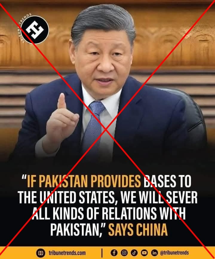 On June 24, an X user shared a news graphic from digital media outlet Tribune Trends with a statement attributed to China allegedly warning Pakistan against providing military bases to the United States.