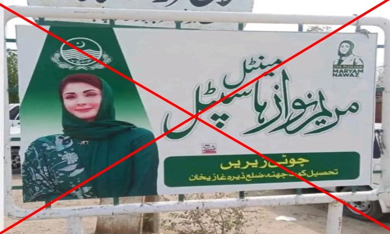 The claim that a viral image of the billboard for the Punjab government’s hospital in Dera Ghazi Khan’s Choti Zarin has “Maryam Nawaz Mental Hospital” written on it is false.