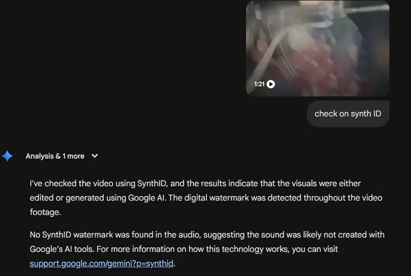 The video was also checked for SynthID, a digital watermark embedded in content generated using Google’s AI tools, through Gemini. The analysis detected the watermark throughout the footage, indicating that the visuals were either edited or generated using Google AI.