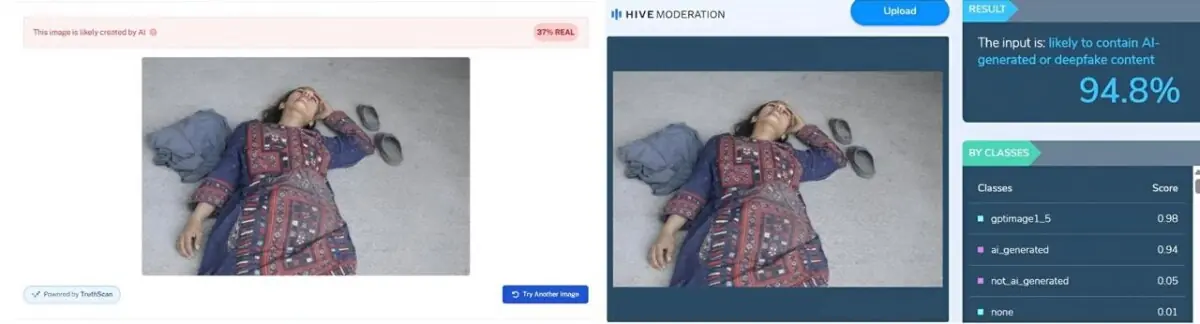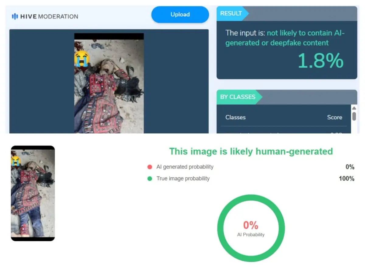 Both images were analysed using AI-detection tools to determine their authenticity. The tools showed that the image showing visible blood was flagged as likely being real, while the bloodless version was AI-generated.