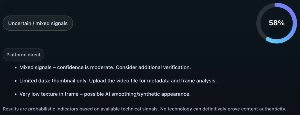 Analysing the clip with the AI-detection tool Detect Videos AI, it was flagged as having “uncertain or mixed signals” and received a 58 per cent confidence score.
