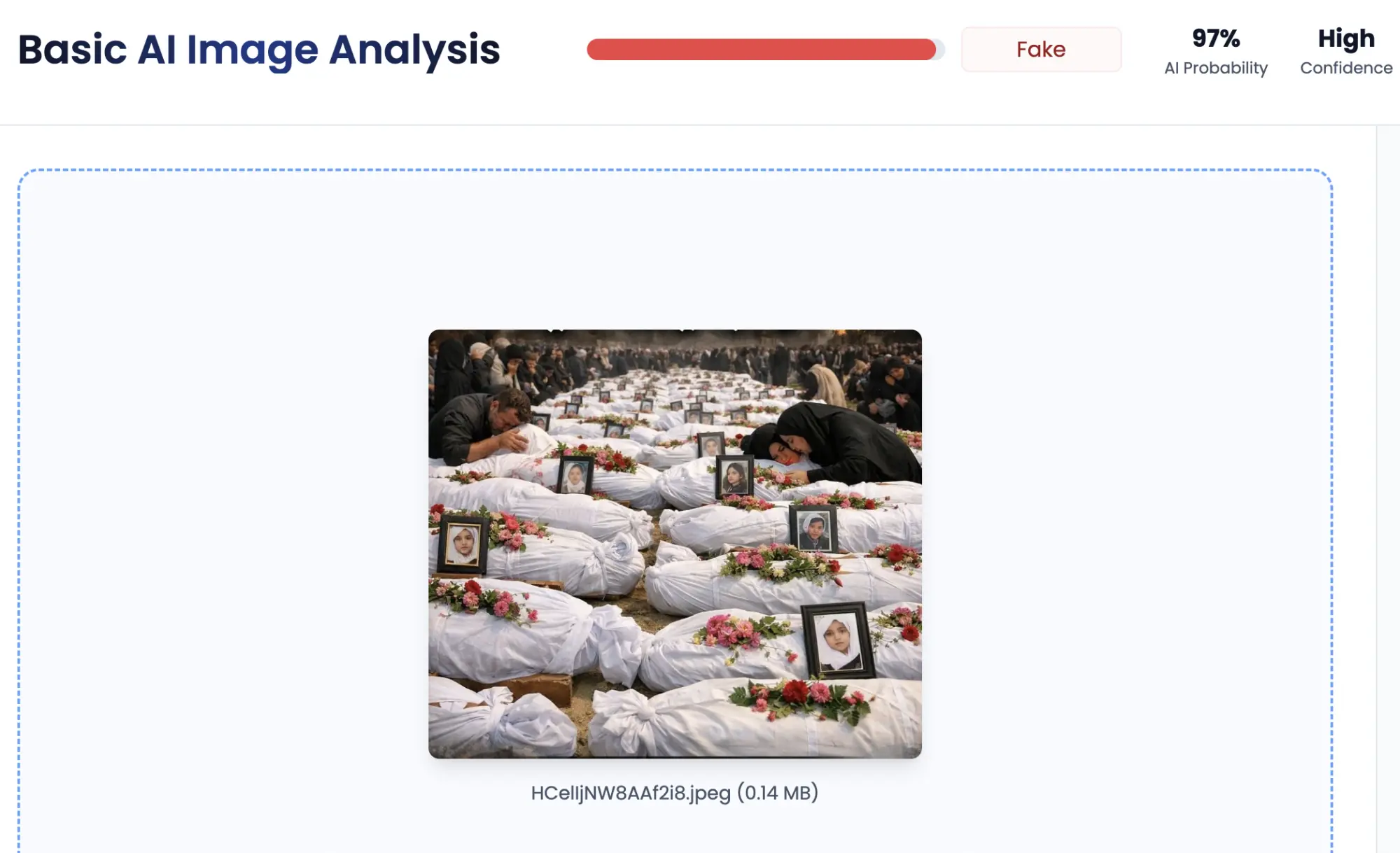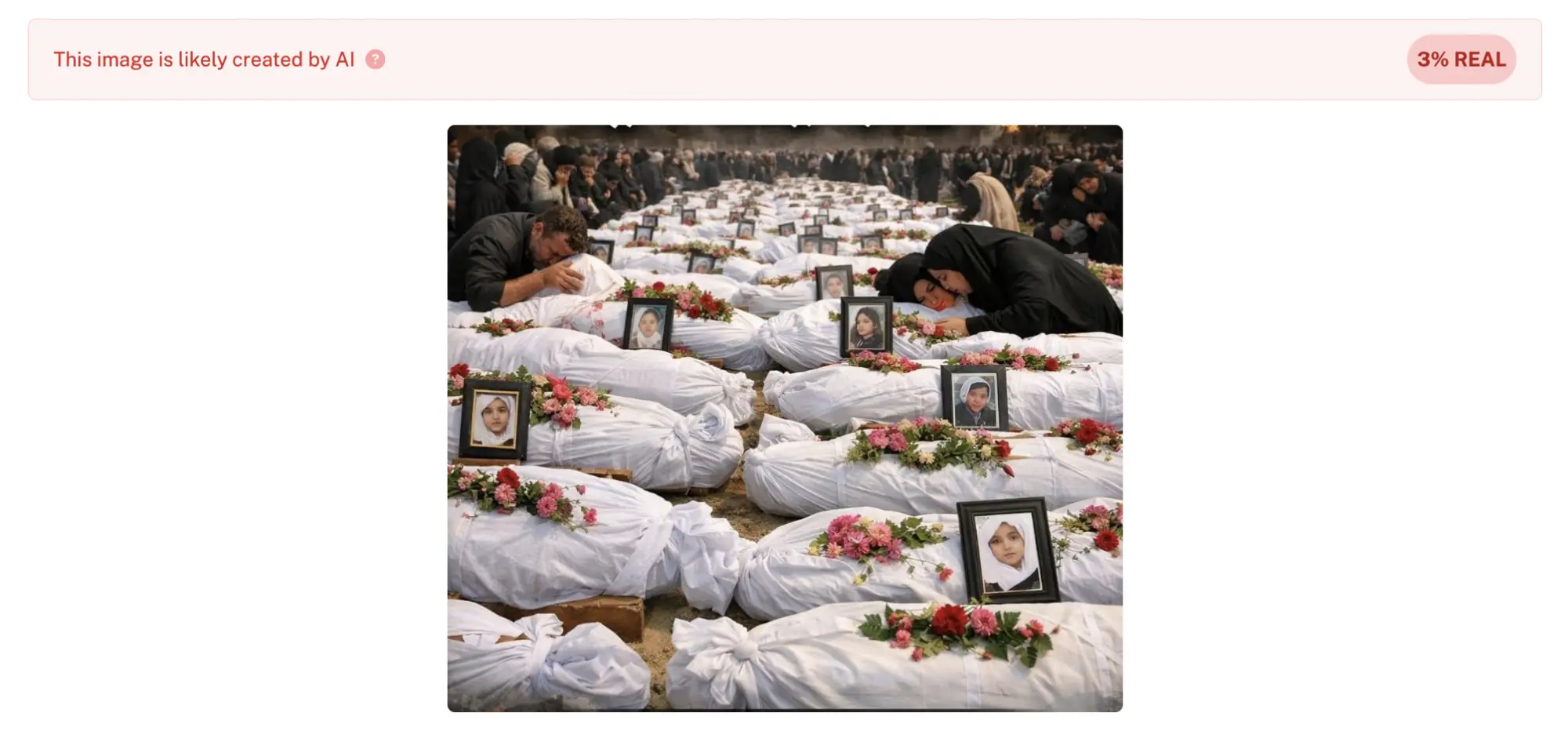 A closer analysis of the image revealed visual inconsistencies; firstly, the photoframes placed next to two bodies are exactly the same. Secondly, the hand of the grieving man — on the top left of the photo — and areas where skin meets fabric show slight blending distortions, a known weakness in AI image generation.