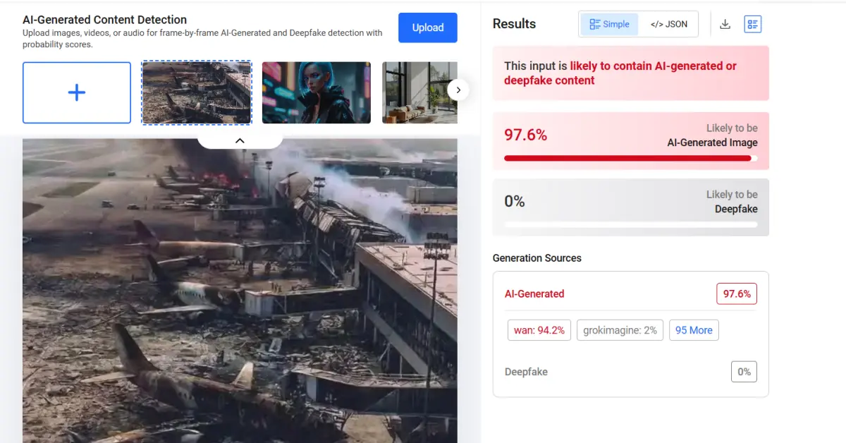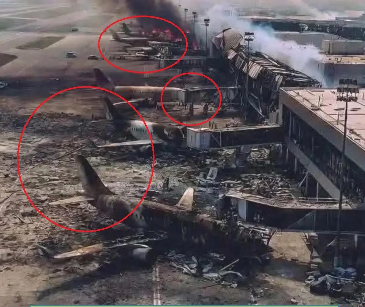 A visual analysis of the image revealed several inconsistencies that suggest it may be AI-generated. The aircraft near the terminal appear distorted and have irregular structures. The debris on the ground also looks uniformly scattered and repetitive, which is often seen in AI-generated images.