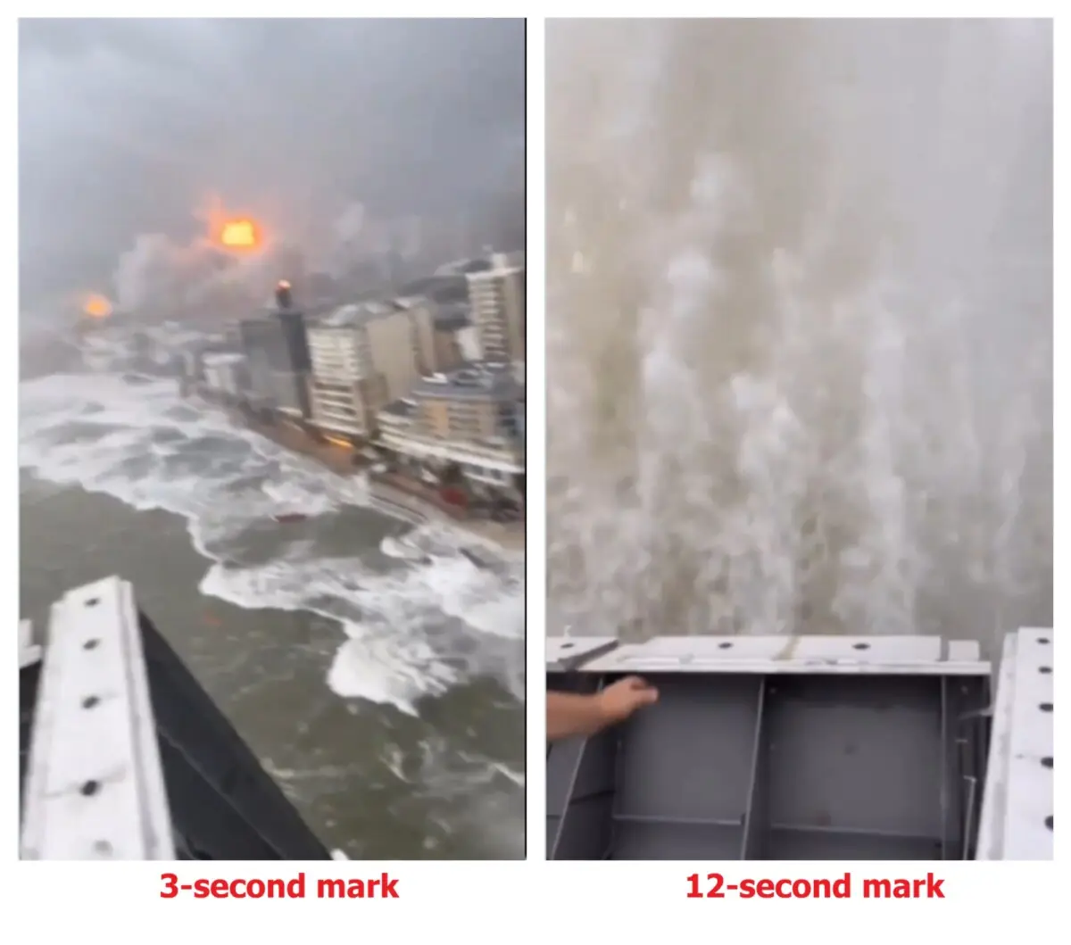 Inspecting the video showed several discrepancies, such as a man being seen standing on a building several storeys high, yet the waves appear to reach him; an implausible scenario outside of a tsunami.