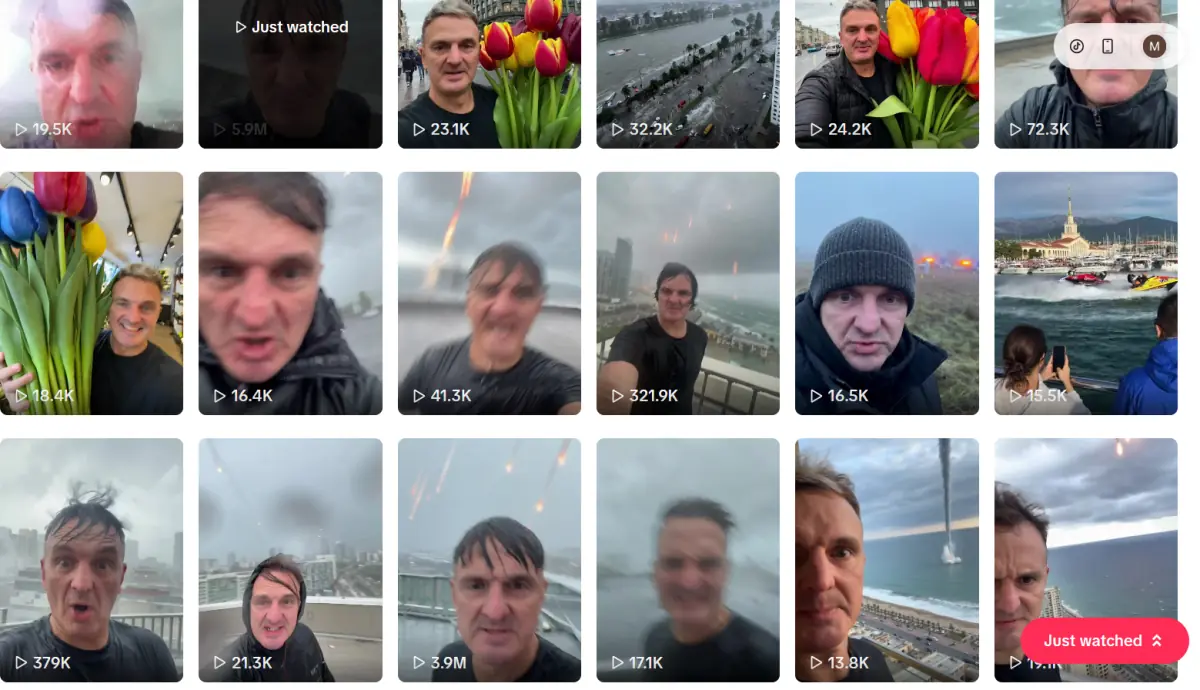 The user, based on his past posts, regularly shares similar AI-generated content, often showing the same man recording catastrophic events from a selfie camera.
