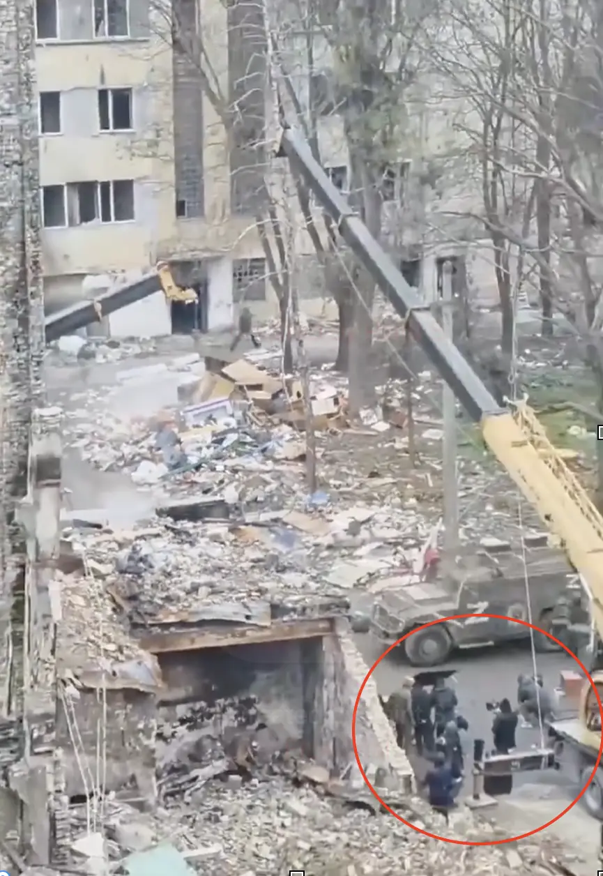 The presence of an organised crew and recording equipment at the alleged destruction site is inconsistent with a footage of a missile strike, suggesting that the scene may have been recorded in a controlled setting rather than depicting a real attack.