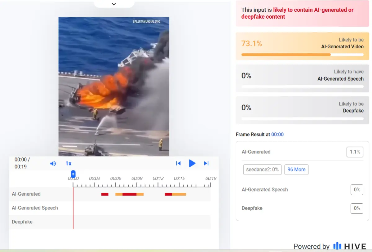 Forensic analysis of the video, conducted to assess the authenticity of the video, showed that AI detection tools such as Hive Moderation flagged it as 73 per cent AI-generated.