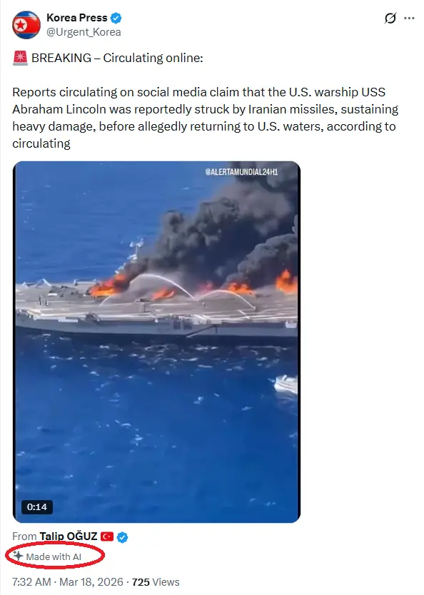 Another pro-Iranian user reshared the video with the caption: “Breaking – Circulating online: Reports circulating on social media claim that the US warship USS Abraham Lincoln was reportedly struck by Iranian missiles, sustaining heavy damage, before allegedly returning to U.S. waters, according to circulating.”