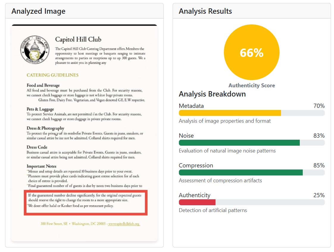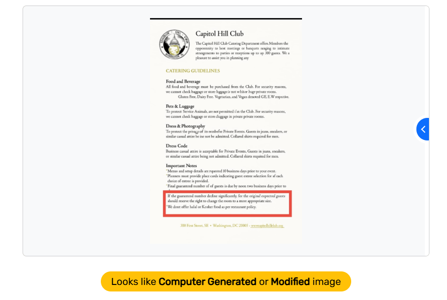 To reach this conclusion, iVerify Pakistan analysed the document via AI and fake image detection tools, investigated the Capitol Hill Club’s menu and conducted a keyword and reverse image search to find the original source.