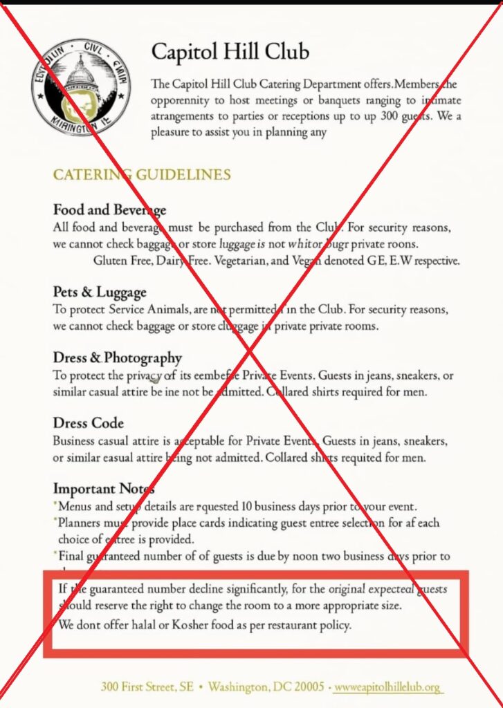 The claim that the catering guidelines of the Capitol Hill Club mention that it does not serve halal or Kosher food is false.