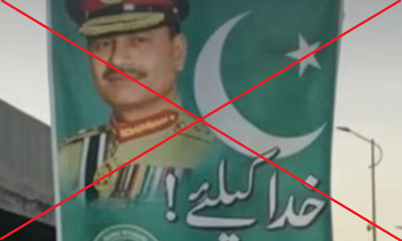 The report showed that manipulation of the original Gen Sharif poster is not a new phenomenon and was done previously as well with the image of former army chief Gen (r) Qamar Javed Bajwa crudely doctored onto the original banner and shared in the same way as the current one featuring Field Marshal Munir.