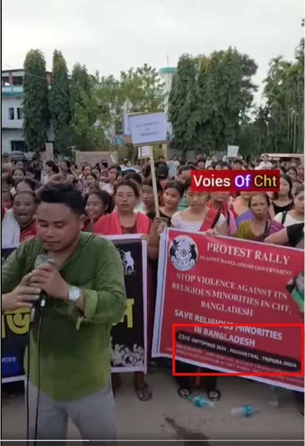 A close assessment of the video showed that one of the banners held by the demonstrators, red in colour, was inscribed with the text “23rd September, 2024, Pencharthal, Tripura, India”.