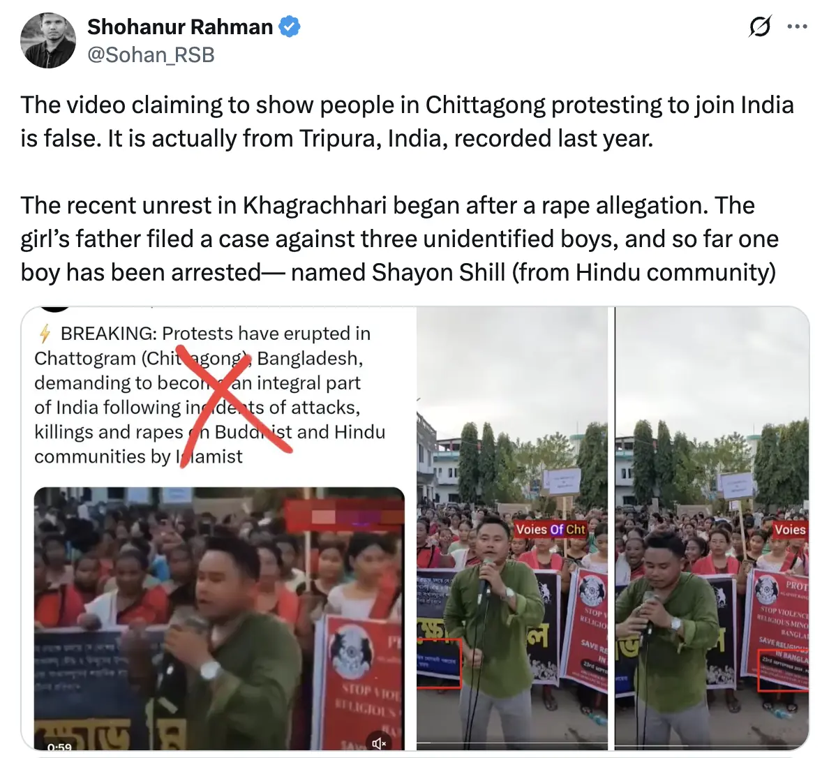This was corroborated by an X user with a verified account, who describes himself as a fact-checker. In a tweet, Shohanur Rahman said, “The video claiming to show people in Chittagong protesting to join India is false. It is actually from Tripura, India, recorded last year.”