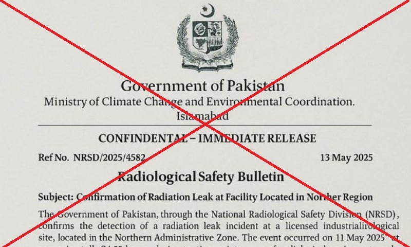 It read, “The Government of Pakistan, through the National Radiological Safety Division (NRSD), confirms the detection of a radiation leak incident at a licensed industrialogical site, located in the Northern Administrative Zone.”