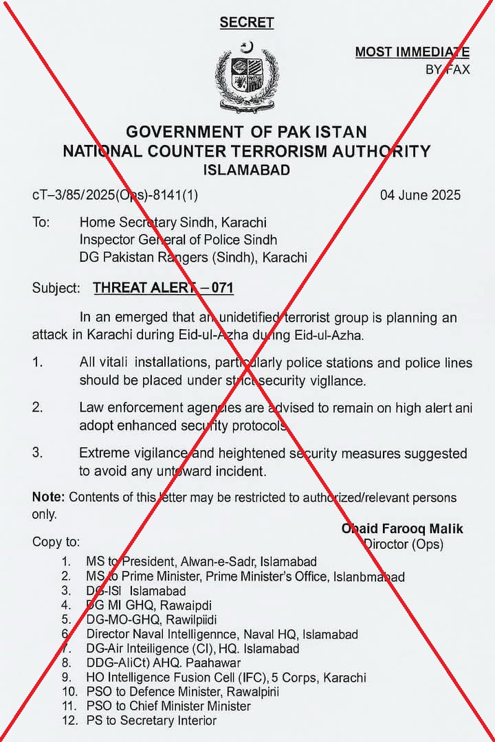 Posts on social media platforms X and Facebook since June 4, 2025, were sharing an alleged threat alert from the National Counter Terrorism Authority (Nacta) of a possible terror attack in Karachi during Eidul Azha. However, the threat alert is fake.