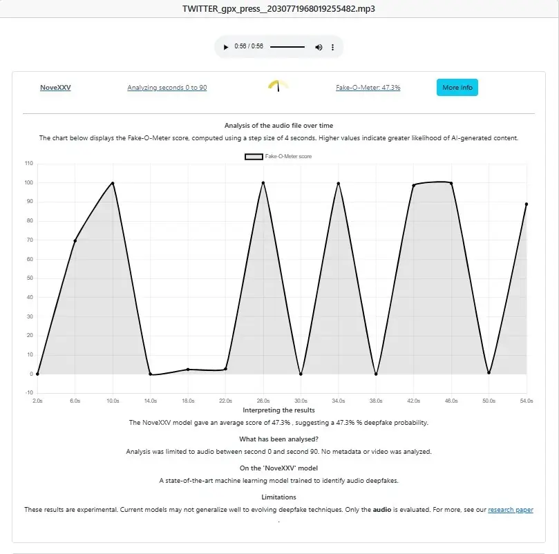 The audio of the clip was analysed using forensic tool Fake-O-Meter, which suggested a deepfake probability of 47.3 per cent.